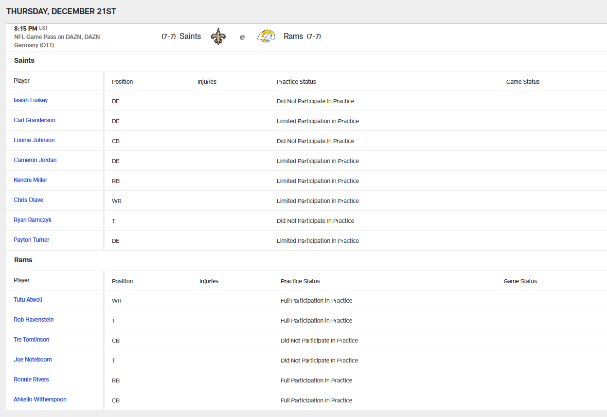 Die Rams sind auf Playoff-Kurs! Nach dem Sieg gegen die Commanders steht das Team aus Los Angeles mit einem Record von 7-7 auf dem siebten Platz der NFC, was bedeutet, dass die Rams eines der begehrten Playofftickets aus eigener Kraft sichern könnten. In der Nacht von Donnerstag auf Freitag könnte man den Playoffs noch einen Schritt näher kommen, denn das Spiel gegen die Saints ist in doppelter Hinsicht wichtig: Zum einen sind die Saints (ebenfalls 7-7), ein direkter Konkurrent im Kampf um die Wildcard, zum anderen würde ein Sieg in der NFC die Tiebreaker innerhalb der Conference verbessern. Das Spiel findet am 22.12.2023 um 02:15 deutscher Zeit statt.