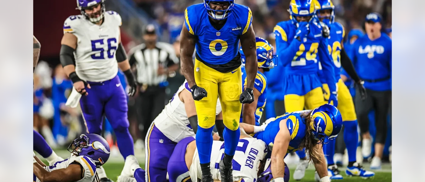 Bereits im ersten Play des Abends konnten die Rams direkt starken Raumgewinn erzeugen. Ein tiefer Play Action Pass über die Mitte, der direkt in die Hände des offenen WR Puka Nacua fiel, sorgte für starke 27 Yard Raumgewinn. Der nächste Pass fand Tyler Higbee für 23, wodurch die Rams nach wenigen Minuten bereits an der Endzone der Vikings anklopften. Ein Checkdown auf Williams in der Endzone bescherte Los Angeles die ersten Punkte, ein ungewohnter Anblick, so früh im Spiel schon zu scoren. Die Defense war ebenfalls direkt da. Nach einem guten Tackle von Speights sowie dem ersten Sack des Abends (Spoiler: es werden noch ein paar mehr), musste das Team aus Minnesota nach nur drei Plays wieder vom Feld. Die Offense drückte weiterhin aufs Gas und konnte durch Plays von Higbee, Robinson und Williams tief ins Feld der Vikings marschieren. Eine unnötige Flagge an Beaux Limmer, welcher für Unnecessary Roughness bestraft wurde, brachte die Rams in ein ungünstiges 3rd Down, welches nicht in genug Raumgewinn umgewandelt werden konnte, wodurch Karty aus 34 Yards das zwischenzeitliche 0:10 erzielte. Die Vikings Offense fand im folgenden Drive zum ersten Mal ein wenig Rhythmus und konnte durch kurze Pässe, sowie einem Big Play auf Jefferson über das Feld marschieren. Einen Touchdown wusste die Rams Defense zu verhindern, da Kobie Turner durch einen Sack an Darnold den Drive der Vikings stoppen konnte. Kicker Will Reichard traf zum 3:10. Der nächste Drive der Rams wurde wild. Beim ersten Play der Serie wurde Stafford von Greenard zu Boden gebracht. Der Spielmacher der Rams warf im Fallen den Ball noch grob in Richtung Puka Nacua, fand aber keinen Abnehmer, wodurch Vikings LB Blake Cashman den Ball aufhob und in die Endzone zum vermeintlichen Touchdown trug. Die Schiedsrichter sahen sich das Play allerdings nochmal an und werteten die Abgabe von Stafford als Pass. Da Nacua in Reichweite stand, gab es auch keine Strafe für intentional Grounding. Die Rams hätten sich bei einer Flagge hier nicht beschweren dürfen. Die Serie endete dennoch zwei Plays später, da die Rams kein Raumgewinn erzielen konnten. Der folgende Drive wurde wieder von der Rams Defense dominiert. Cobie Durant konnte Darnold nach einem CB Blitz zu Fall bringen und wenige Minuten später einen Pass abfangen, wodurch die Vikings wieder ohne Punkte vom Feld mussten. Der Rams Drive wurde direkt durch eine Strafe um 10 Yards nach hinten versetzt und ende nach 3 Plays mit einem Punt. Wer jetzt der Meinung war, dass die Offense der Vikings endlich in Fahrt kommen würde, lag falsch: Die D-Line konnte, nachdem die Vikings im Territorium der Rams angelangten, wieder massiv Druck auf Darnold ausüben. Abermals wies DC Chris Shula einen CB Blitz an, diesmal war es Whitherspoon, der Darnold sacken und ein Fumble forcieren konnte. Jared Verse nahm gedankenschnell den Ball auf und lief ungehindert aus 57 Yards in die Endzone. Mit einem eingesprungenen Salto erzielte er den zweiten Touchdowns des Abends. Die Vikings waren durch die guten Leistungen sichtlich verunsichert, denn der nächste Drive wurde ebenfalls vom Rams Pass Rush dominiert. Byron Young sammelte einen weiteren Sack in dieser Serie und Kobie Turner forcierte ein Big-Play bei 4th & 2 an der 50, da er Darnold für -11 Yards zu Fall brachte und der Rams Offense an der 39 der Vikings überragende Field Position sicherte. Die Offense wusste die Chance zu nutzen und Stafford bediente TE Davis Allen, der völlig freistehend nach einem kurzen Pass seinen zweiten NFL Touchdown erlaufen konnte.