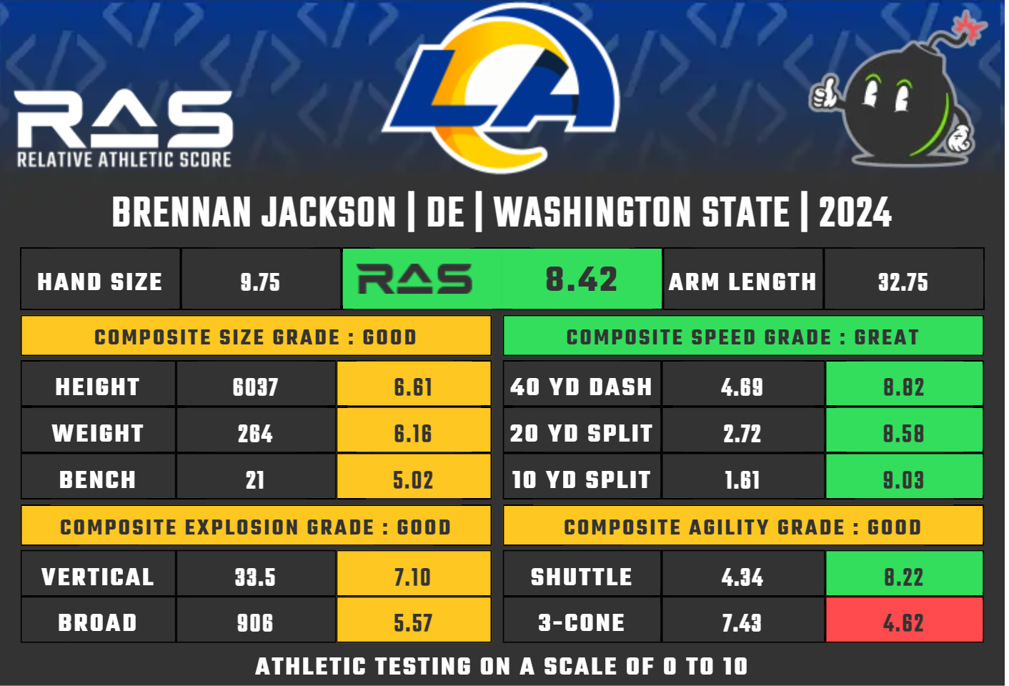 Brennan Jackson ist ein talentierter Spieler mit einem guten Rahmen und beeindruckenden Bewegungsfähigkeiten. Er kann Geschwindigkeit in Kraft umwandeln, was ihm oft einen Vorteil gegenüber seiner Gegner bringt. Die Rams Coaches werden viel Arbeit und Zeit in sein Handplacement und sein Pad Level stecken müssen. Mit dem richtigen Coaching und spürbaren Verbesserungen in diesem Bereich wird Brennan Jackson ein rotierender Defender bei den Rams sein, der möglichweise als Linebacker vor allem in Third Down Situationen helfen kann.